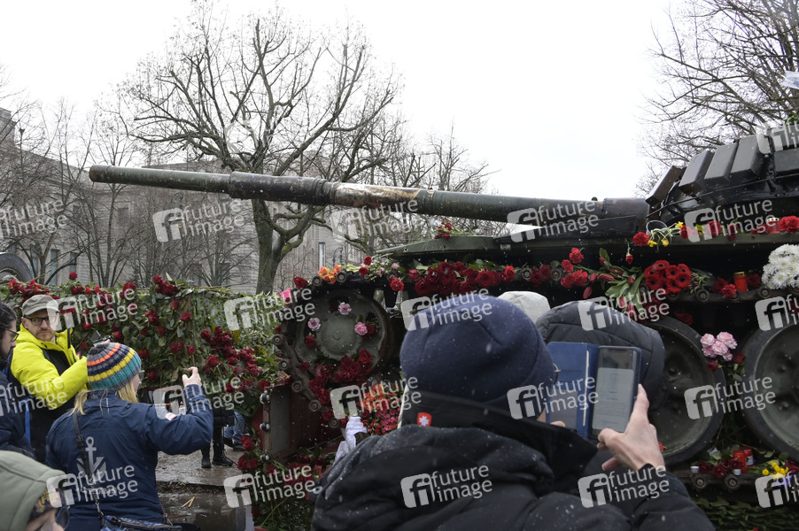 Mit Blumen geschmückter, zerstörter russischer Panzer vor der russischen Botschaft in Berlin - Umstrittene Friedensdemo und Kundgebung für Verhandlungen mit Russland statt Waffenlieferungen für die Ukraine am Brandenburger Tor. Dazu aufgerufen haben die Linken-Politikerin Sahra Wagenknecht und die Frauenrechtlerin Alice Schwarzer. Berlin, 25.02.2023