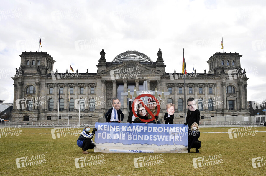 Aktivisten mit Masken von Drohnen-Befürwortern und der 'Eurodrohne' bei der Fotoaktion 'Keine Kampfdrohnen für die Bundeswehr!' vor dem Bundestagsgebäude. Berlin, 18.03.2021