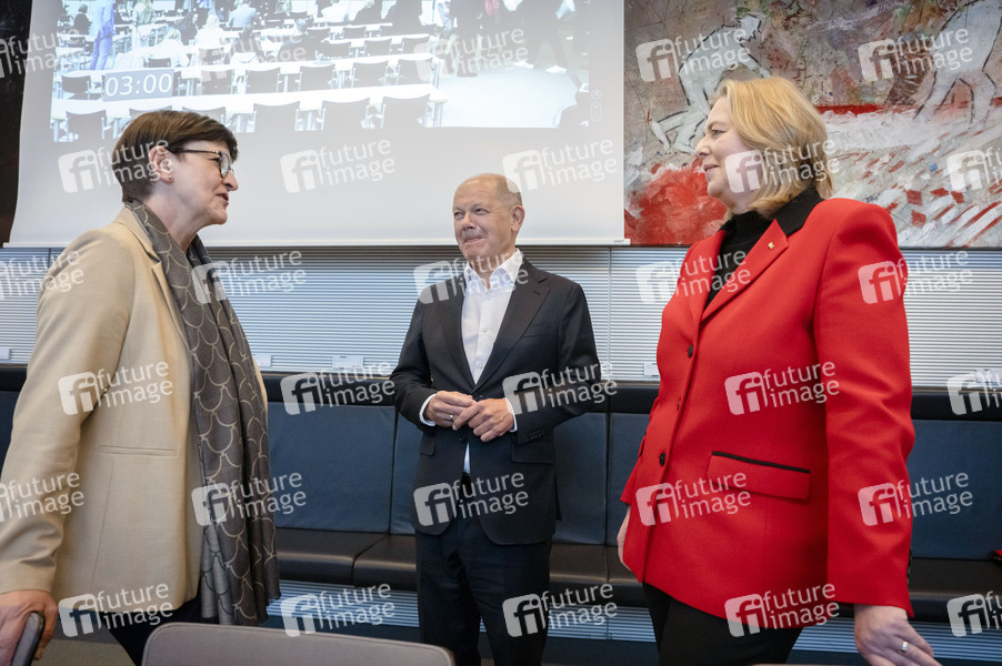 Saskia Esken, Olaf Scholz und Bärbel Bas bei der Fraktionssitzung der SPD-Bundestagsfraktion im Reichstagsgebäude. Berlin, 05.05.2025