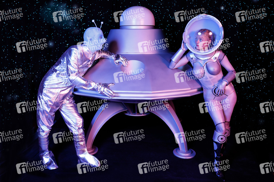 Projekt Farbkörper, Bodypainting, Body-Painting, Cosplay, Cosplayer, Körperkunst, Körperfarben, Farbe, Bemalung, Kunst, Make-up, Latexapplikationen, Maskenbildnerei, unbekanntes Flugobjekt, unidentifiziertes Flugobjekt, Außerirdische, fliegende Untertasse, Raumschiff, Fünfziger Jahre, Retro, Landung, Science Fiction, Pin-up, body painting, body art, latex applications, unknown flying object, spacecraft, flying saucer, landing, colors, fifties, alien, unidentified flying object