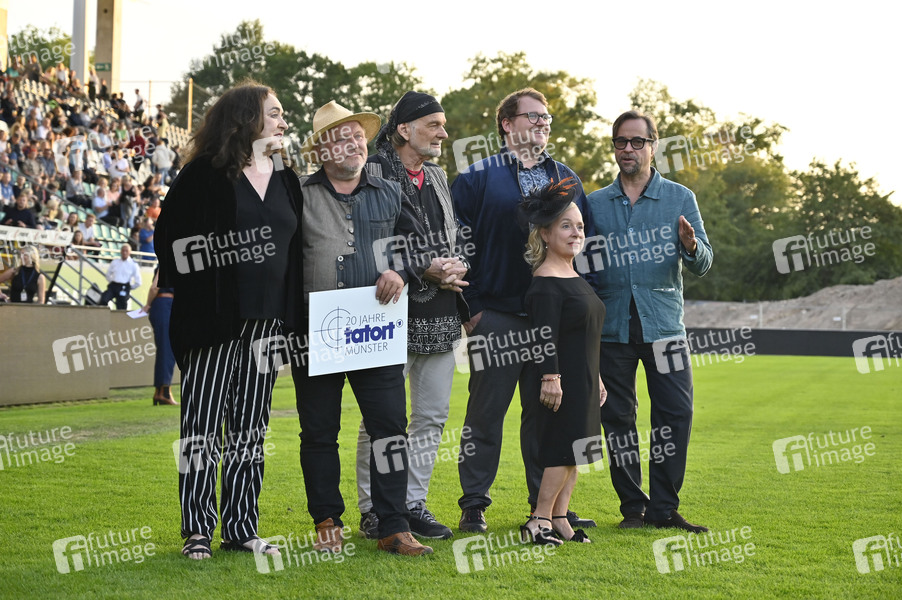 Mechthild Großmann, Axel Prahl, Claus Dieter Clausnitzer, Björn Meyer, ChrisTine Urspruch und Jan Josef Liefers bei der Premiere des ARD-Krimis 'Tatort - Ein Freund, ein guter Freund' zum 20 jährigen Jubiläum des Münsteraner Tatorts im Preußenstadion. Münster, 30.08.2022