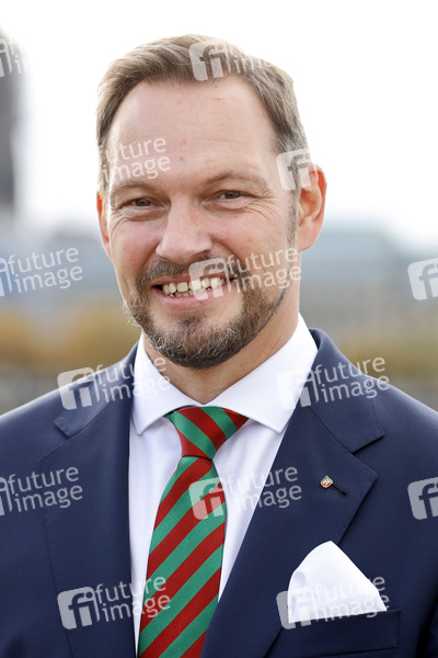 Prinz Sven I. (Sven Oleff) vom Kölner Karnevalsverein Traditionskorps Altstädter Köln 1922 e.V. beim Fototermin mit dem Kölner Karneval Dreigestirn der Session 2020/2021 auf den Rheinterrassen. Die neue Session steht unter dem Motto 'Nur zesamme sin mer Fastelovend (Nur zusammen sind wir Karneval)'. Köln, 26.10.2020