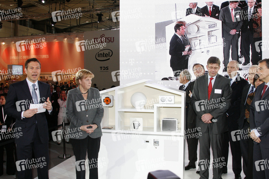 Eröffnungsrundgang von Bundeskanzlerin Merkel und Spaniens Ministerpräsident Zapatero auf der CeBIT 2010 (Centrum der Büro- und Informationstechnik), der weltgrößten Messe für Informations- und Computertechnik auf dem Messegelände in Hannover. Auf dem Messestand der Telekom.
