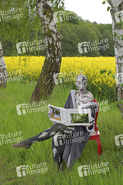 Nature Art: Rapsbirken Bodypainting und Photoshooting. Model Anastasia mit dem Fotobildband 'Bodypainting in Nature - Farbige Symbiosen' von Jörg Düsterwald. Behrensen, 14.05.2025 - Bodyart-Künstler: Jörg Düsterwald