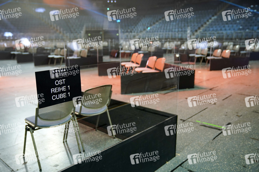 Cubes und Sitzplätze unter Einhaltung der Hygienerichtlinien und der Abstandsregeln bei der Pressekonferenz zur Vorstellung des neuen Veranstaltungskonzepts 'Arena Now!' in der Lanxess Arena. Köln, 18.06.2020