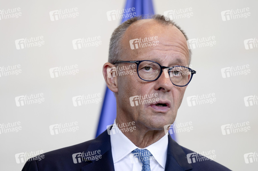 Friedrich Merz beim Empfang des Premierministers von Belgien mit militärischen Ehren zu einem gemeinsamen Gespräch mit anschließendem Pressestatement im Bundeskanzleramt. Berlin, 26.08.2025