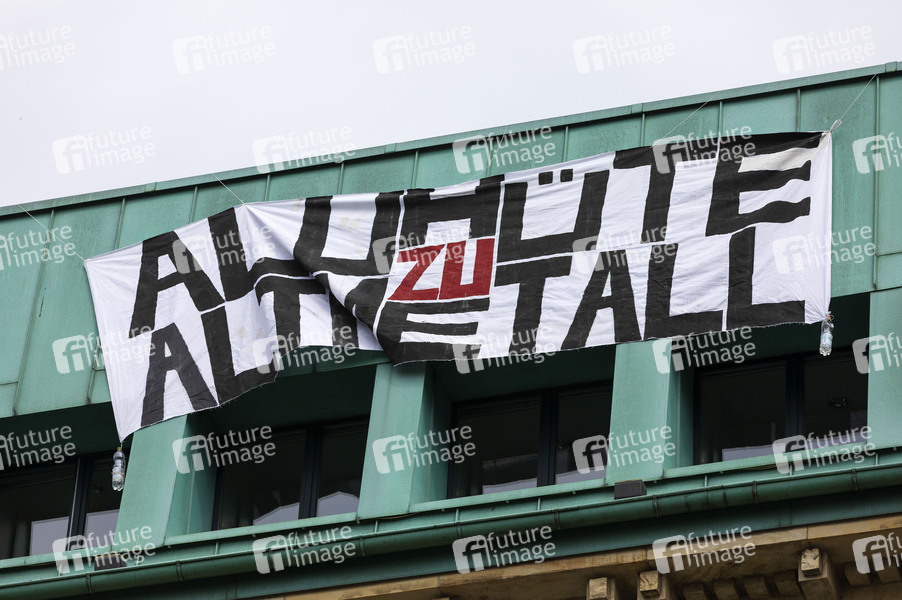 Gegendemonstranten der Demonstration gegen die Coronamaßnahmen zünden auf Hausdächern Bengalische Feuer und entrollen ein Spruchband mit der Aufschrift 'Aluhüte zu Altmetall' in der Innenstadt. Hannover, 16.05.2020