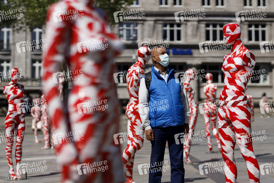 Kunst-Installation 'It is like it is - Mahnmal zur Coronakrise - 2020', einer Installation aus 111 maskierten Schaufensterpuppen, von Dennis Josef Meseg anlässlich der strengen Maßnahmen der Bundesregierung wegen der Coronakrise auf der Domplatte. Köln, 05.05.2020