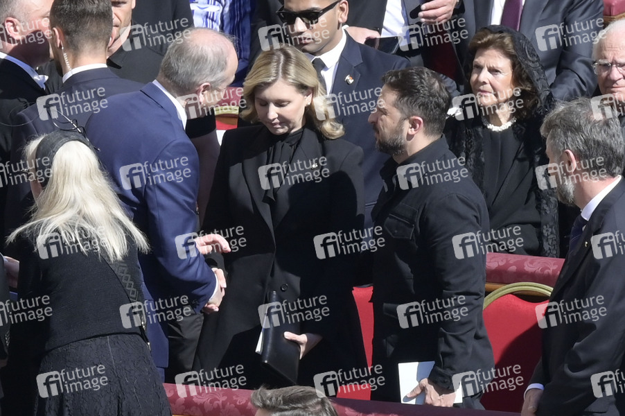Wolodymyr Selenskyj / Volodymyr Zelenskyy mit Ehefrau Olena Selenska bei der Trauermesse für den verstorbenen Papst Franziskus auf dem Petersplatz. Vatikanstadt, 26.04.2025