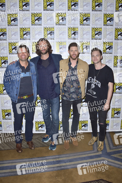 Misha Collins, Jared Padalecki, Jensen Ackles und Alexander Calvert beim Photocall zur The WB TV-Serie 'Supernatural' auf der San Diego Comic-Con International 2019 im Hilton Bayfront Hotel. San Diego, 21.07.2019