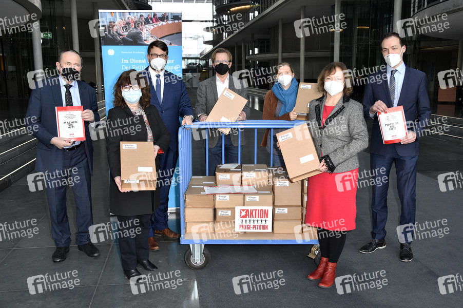 Manfred Todtenhausen, Martina Stamm-Fibich, Marian Wendt, Dr. Bernhard Albrecht, Corinna Rüffer, Kerstin Kassner und Johannes Huber bei der Übergabe der Unterschriftenlisten zur Pflege-Petition 'Gesundheitsreform für eine bessere Pflege' an den Petitionsausschuss des Deutschen Bundestags im Paul-Löbe-Haus. Berlin, 11.02.2021