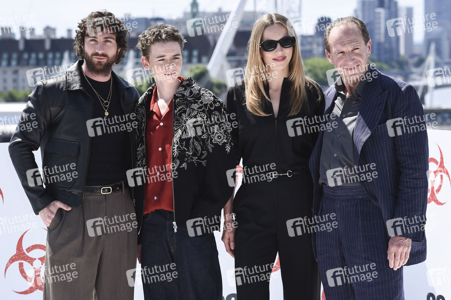 Aaron Taylor-Johnson, Alfie Williams, Jodie Comer und Ralph Fiennes beim Photocall zum Kinofilm '28 Years Later' auf der Dachterasse des IET London Savoy Place. London, 16.06.2025