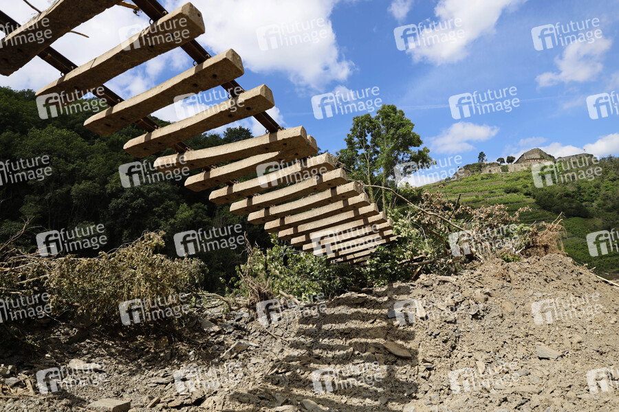 Nach dem Jahrhunderthochwasser in der Eifel durch heftige Regenfälle und Dauerregen mit Überschwemmungen und Überflutungen haben die Aufräumarbeiten im Ahrtal große Fortschritte gemacht. Einheiten von Polizei, THW, Bundeswehr und Feuerwehr mitsamt vielen freiwilligen Helfern haben Straßen geräumt, Schutt und Schlamm entfernt und die Menschen versorgt. Der Wiederaufbau wird trotzdem Jahre dauern. Im Bild Flutschäden nahe der Ortschaft Rech, in der die Flut viele Häuser zerstörte, 30.07.2021