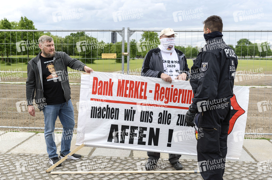 Polizist und Demonstranten bei einer unangemeldeten Versammlung gegen die Einschränkung der Grundrechte durch die Corona-Eindämmungsverordnung vor dem Reichtagsgebäude in Berlin. An dem Protest beteiligten sich Verschwörungstheoretiker, Impfgegner aber auch rechte Gruppierungen und Hooligans. Berlin, 23.05.2020