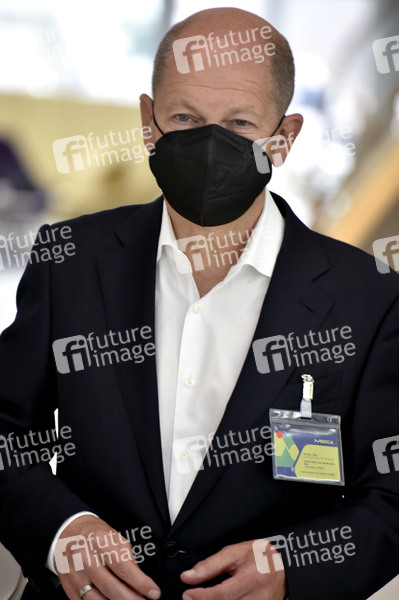 Olaf Scholz bei einem Statement nach einem Unternehmensbesuch bei der Merk KGaA im Innovation Center. Darmstadt, 26.08.2021
