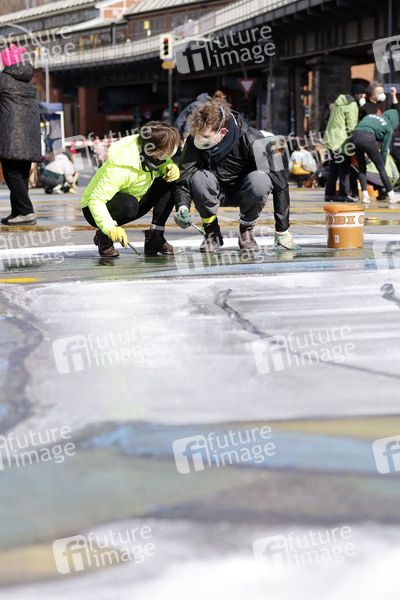 Am Freitag finden mehrere Demonstrationen zum globalen Klimastreik von Fridays for Future in Berlin statt. An der Oberbaumbrücke bemalen Aktivisten die Straße zum Thema 'Another World is possible'. Berlin, 19.03.2021