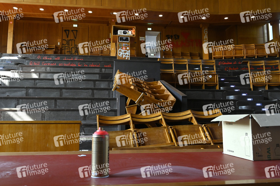 Nach einer Besetzung des Emil-Fischer-Saals der Humboldt-Universität durch propalästinensische Aktivisten die durch die Polizei geräumt wurde, sind offenbar so umfangreiche Schäden entstanden, dass der Raum nicht mehr nutzbar ist. Berlin, 22.04.2025