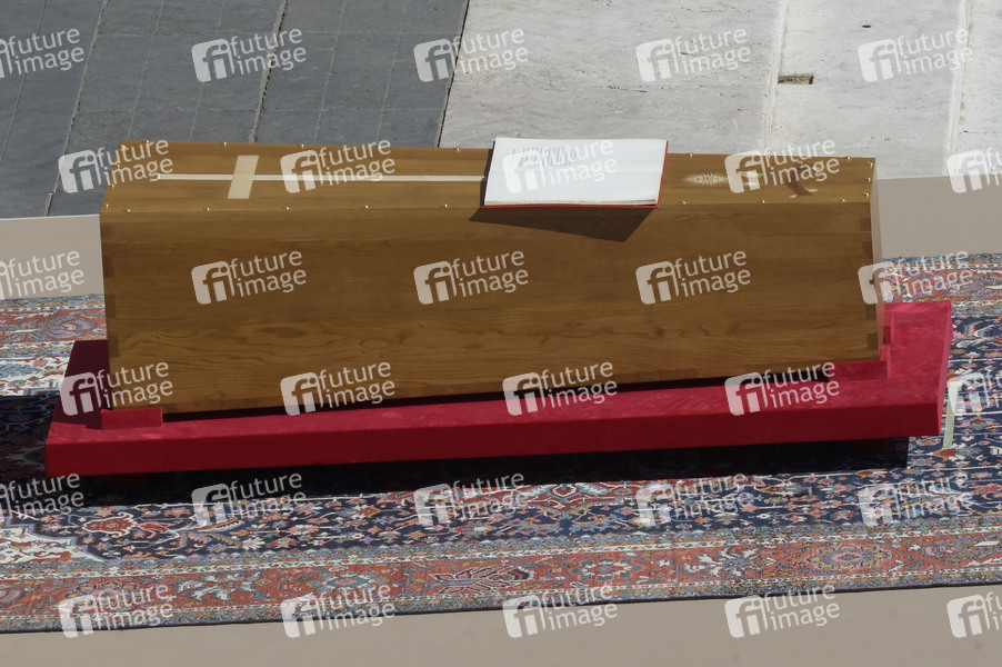 Der Sarg bei der Trauermesse für den verstorbenen Papst Franziskus auf dem Petersplatz. Vatikanstadt, 26.04.2025