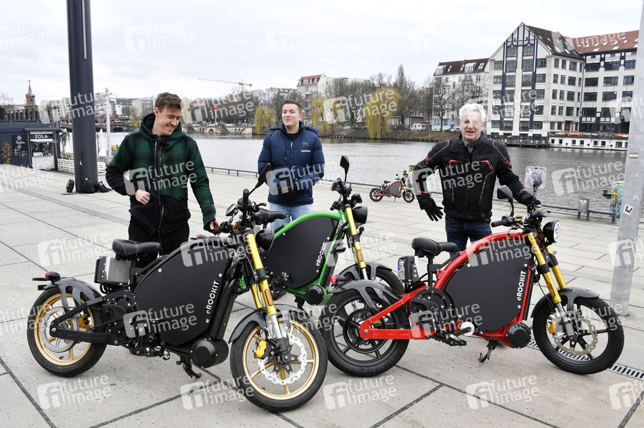 Max Kruse, Aaron Troschke und Andy Zurwehme beim Fototermin zur Eröffnung der Zweiradsaison 2021 mit eROCKIT an der East Side Gallery. Berlin, 11.03.2021