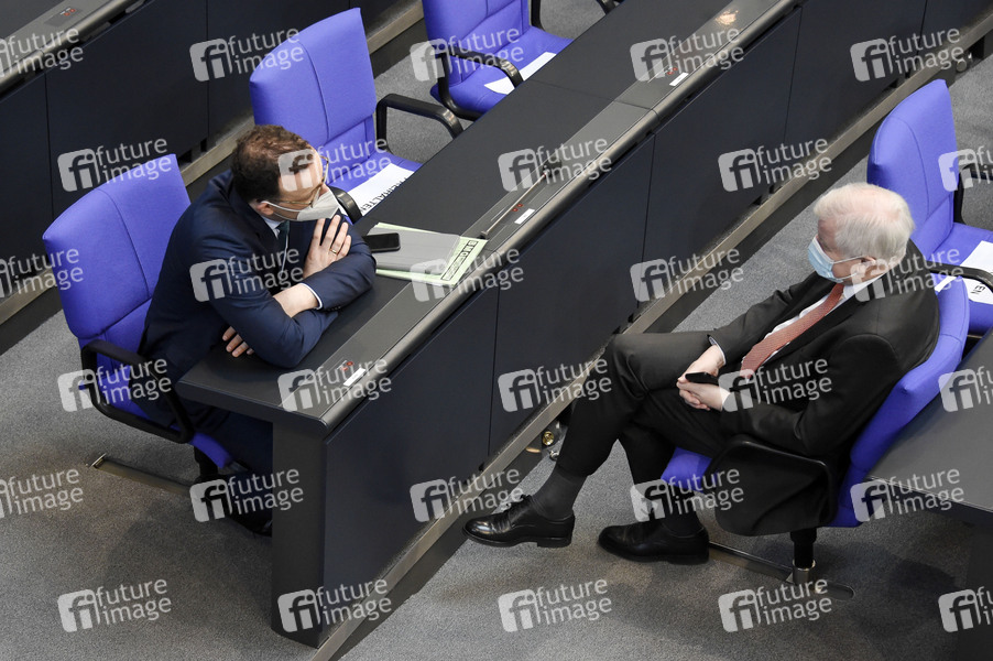 Jens Spahn und Horst Seehofer in der 218. Sitzung des Deutschen Bundestages im Reichstagsgebäude. Berlin, 25.03.2021