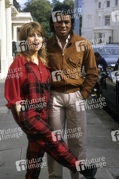 Pia Zadora und Jermaine Jackson beim Photocall vor einem Hotel. London, 10.09.1984