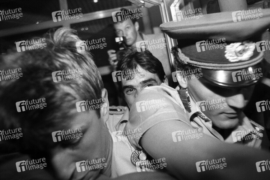 Volkspolizisten versuchen dem Andrang bei der Deutschen Bank am Alexanderplatz, wo ab Mitternacht des 1. Juli 1990 die D-Mark ausgegeben wird, Herr zu werden. Berlin, 01.07.1990