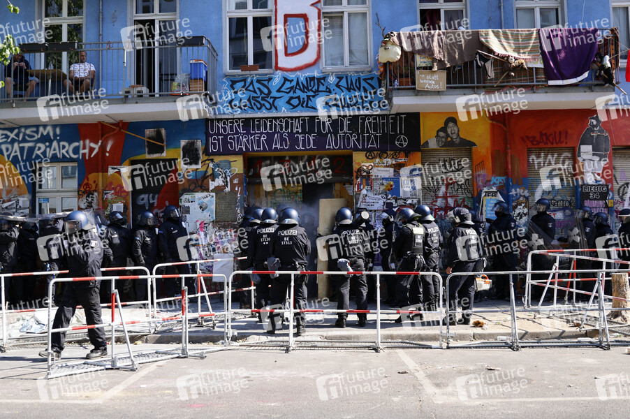 Im teilbesetzten Haus in der Rigaer Straße 94 sollte am Donnerstag der Brandschutz überprüft werden. Nachdem die Bewohner sich zunächst weigerten, die Tür zu öffnen, verschaffte sich die Polizei gewaltsam Zutritt und wurde mit Farbe beworfen. (Quelle: rbb online) Berlin, 17.06.2021