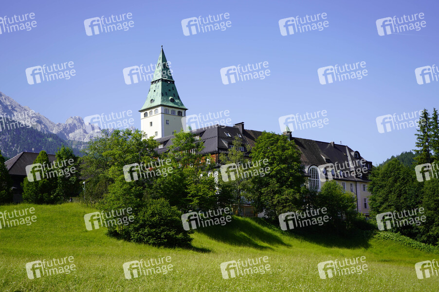 Schloss Elmau beim Fototermin zum erweiterten Familienfoto im Rahmen der Outreach-Arbeitssitzung am zweiten Tag des G7-Gipfels. Die Staats- und Regierungschefs der G7-Gruppe kommen offiziell unter dem Motto 'Fortschritt hin zu einer gerechten Welt' zusammen und werden globale Themen wie Krieg, Klimawandel, Hunger, Armut und Gesundheit diskutieren. Der Gipfel wird vom anhaltenden russischen Krieg gegen die Ukraine überschattet. Klais, 27.06.2022