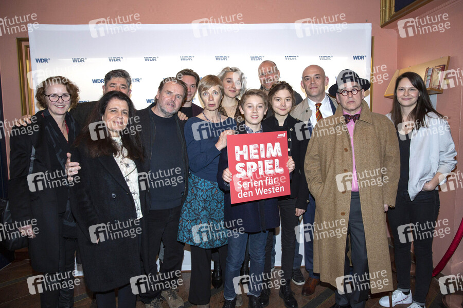 Elke Kimmlinger, Christina Voss-Michalke, Johannes Rotter, Felix Vörtler, Alvar Julian Goetze, Anna Stieblich, Antonia Lingemann, Moritz Klaus, Markus Hoffmann, Hannah Schiller, Robert Dölle, Ulrich Lask und Katarina Cvitic bei der Präsentation des neuen Primetime-Sendeplatzes 'Heimspiel - Serien für den Westen' mit den Previews der TV-Serien 'Ohne Schnitzel geht es nicht', 'Phoenixsee' und 'Meuchelbeck' im Lichtspiel- und Kunsttheater Schauburg. Dortmund, 26.03.2019