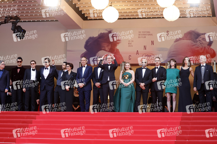 Roman Coppola, Richard Ayoade, Michael Cera, Benicio Del Toro, Riz Ahmed, Rachida Dati, Alexandre Desplat, Rupert Friend, Wes Anderson, Mia Threapleton, Jeffrey Wright, Benedict Cumberbatch, Charlotte Gainsbourg, Antonia Desplat und Bill Murray bei der Premiere des Kinofilms 'The Phoenician Scheme / Der phönizische Meisterstreich' auf dem Festival de Cannes 2025 / 78. Internationale Filmfestspiele von Cannes im Palais des Festivals. Cannes, 18.05.2025