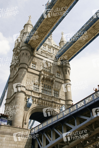 Klappbrücke, Neugotik, 244 Meter lang, Höhe der Brückentürme 65 Meter, die Fahrbahn zwischen den 61 Meter voneinander entfernten Türmen liegt neun Meter über dem Fluss, Fußgängerbrücke in 43 Meter Höhe, die beiden Baskülen können bis zu einem Winkel von 83 Grad hochgeklappt werden, Architekt Horace Jones, erbaut 1886 bis 1894, Themse