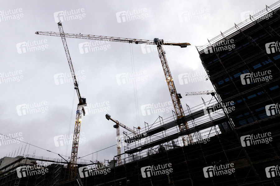 Eine Baustelle mit Baukränen in der Berliner Innenstadt. Die Bauwirtschaft ist seit Jahren ein wichtiger Wachstumstreiber für die deutsche Konjunktur und durch die Coronakrise und die auf Baustellen einzuhaltenden Corona-Regeln unter Druck geraten. (Themenbild, Symbolbild) Berlin, 27.01.2021