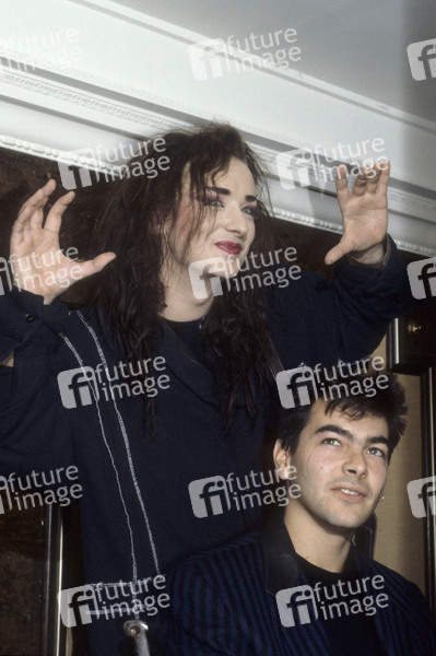 Boy George und John Moss von Culture Club bei einer Pressekonferenz im Royal Garden Hotel. London, 22.11.1983