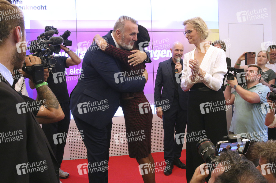 Steffen Schütz, Sahra Wagenknecht und Katja Wolf bei der Wahlparty des BSW nach der Landtagswahl in Thüringen. Erfurt, 01.09.2024