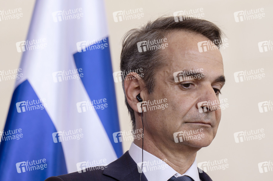 Kyriakos Mitsotakis beim Empfang des Ministerpräsidenten von Griechenland mit militärischen Ehren und zu einem gemeinsamen Gespräch mit dem Bundeskanzler mit anschließendem Pressestatement im Bundeskanzleramt. Berlin, 13.05.2025