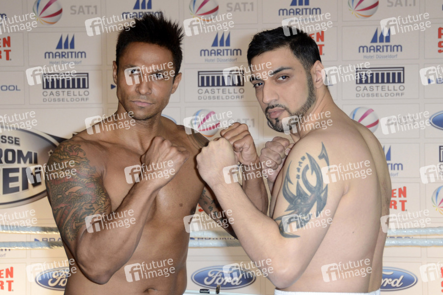 Daniel Aminati und Mehrzad Marashi beim Wiegen zum TV-Kampfevent 'Das große SAT.1 Promiboxen' im Sportgarde Box-Club. Düsseldorf, 06.03.2013
