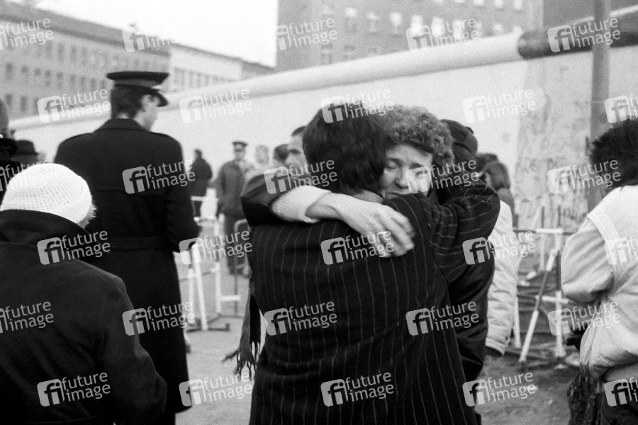 Berlin, Deutschland, DDR, Wende, Wendezeit, friedliche Revolution, Mauerfall, Mauer, Grenzübergang, Maueröffnung, Grenzöffnung, Grenze, Grenzen, Umarmung, Umarmungen, Frau, Frauen, Vereinigung, Wiedervereinigung, Berliner Mauer, Grenzübergangsstelle, Zeitgeschichte, Zeitgeschehen