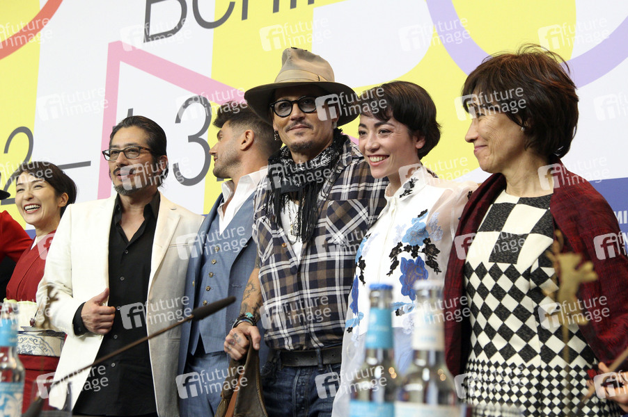 Akiko Iwase, Hiroyuki Sanada, Andrew Levitas, Johnny Depp, Minami Hinase und Aileen Mioko Smith bei der Pressekonferenz zu 'Minamata' auf der Berlinale 2020 / 70. Internationale Filmfestspiele Berlin im Hotel Grand Hyatt. Berlin, 21.02.2020