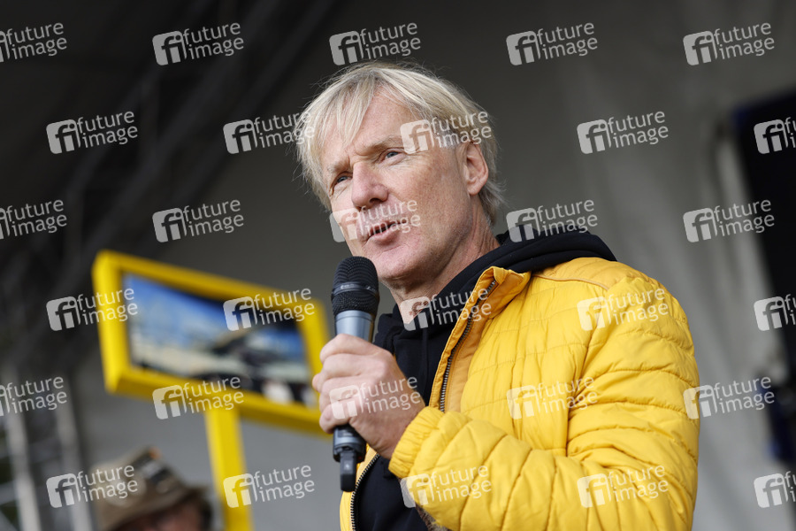Kohlegegner wie Mitglieder von Greenpeace, Fridays for Future und linksradikalen Gruppen wie der Antifa haben in Lützerath gegen den Tagebau protestiert. Das kleine Dorf an der Kante von Garzweiler soll dem Braunkohleabbau weichen. Allerdings will der Energiekonzern RWE vorerst auf den Abriss verzichten. Im Bild Bananensprayer Thomas Baumgärtel. Lützerath, 31.10.2021