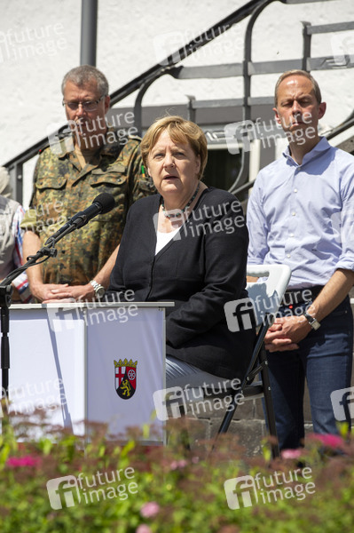 Angela Merkel bei einem Pressestatement am Rathaus nach dem Besuch der Bundeskanzlerin im Eifeldorf Schuld, das schwer von der Unterwetterkatastrophe getroffen wurde. Adenau, 18.07.2021