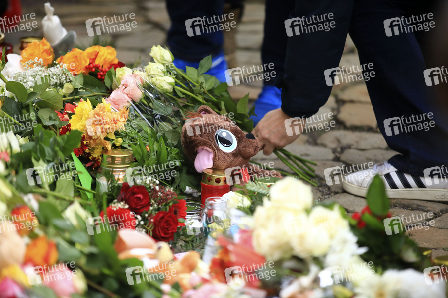 Menschen legen Blumen und Plüschtiere an der Johanniskirche nieder in Gedenken der Opfer des Anschlags auf dem Magdeburger Weihnachtsmarkt. Am Freitagabend war ein Autofahrer auf dem Weihnachtsmarkt in Magdeburg in eine Menschengruppe gefahren. Magdeburg, 21.12.2024