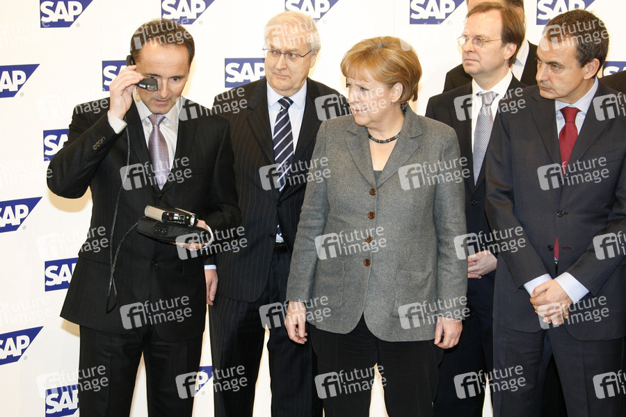 Eröffnungsrundgang von Bundeskanzlerin Merkel und Spaniens Ministerpräsident Zapatero auf der CeBIT 2010 (Centrum der Büro- und Informationstechnik), der weltgrößten Messe für Informations- und Computertechnik auf dem Messegelände in Hannover. Am Messestand von SAP.