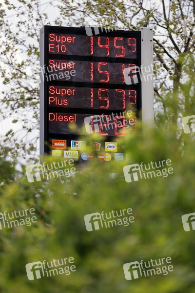 Benzinpreis-Anzeige an einer Tankstelle von Mundorf Tank. Durch die dritte CO2-Steuer für Autofahrer ist das Tanken in Deutschland 2021 noch teurer. Die Grünen haben bereits angekündigt, die Spritpreise nach erfolgreicher Wahl 2021 noch weiter zu erhöhen. (Themenbild, Symbolbild) Troisdorf, 18.05.2021