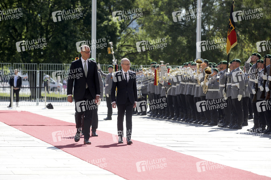 Friedrich Merz und Luc Frieden beim Empfang des Premierministers von Luxemburg mit militärischen Ehren zu einem gemeinsamen Gespräch mit anschließendem Pressestatement im Bundeskanzleramt. Berlin, 01.07.2025