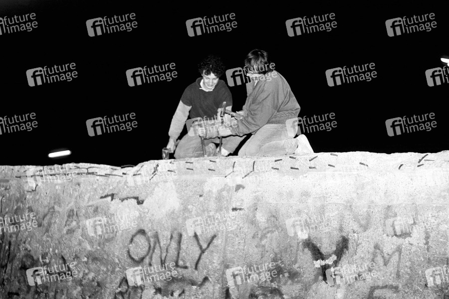 Mauerspechte schlagen Stücke aus der Berliner Mauer in der Nähe vom Brandenburger Tor. Berlin, 08.02.1990