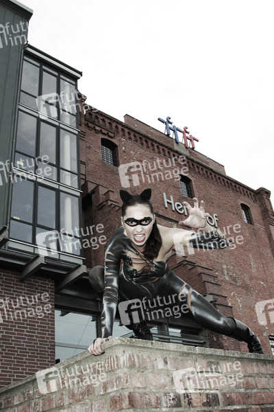 Catwoman Photoshooting mit SOLsnap-Model Elena im Hefehof-Center, Hameln. Bodypaint-Künstler: Jörg Düsterwald
