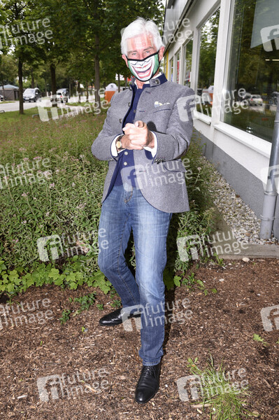Frederic Meisner mit seiner eigenen Joker-Maske nach der Präsentation des ersten Flavura Maskomaten in München vor der Netto-Filiale in Aubing. München, 17.06.2020