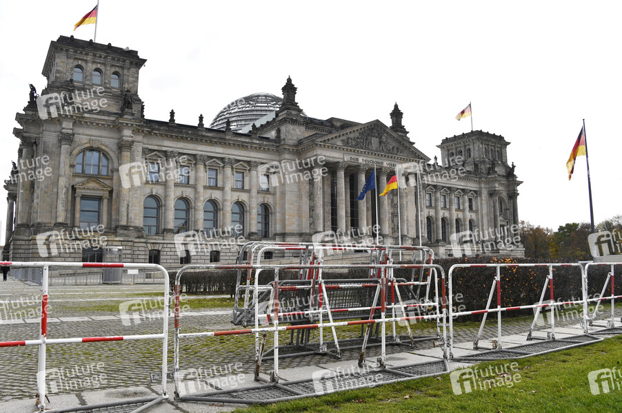 Tausende Demonstranten protestieren am Brandenburger Tor und im Regierungsviertel gegen die Corona-Politik der Regierung. Wegen der massenhaften Verstöße gegen die Hygieneauflagen droht die Polizei mit Auflösung der Versammlung. Das Gelände vor dem Bundestag ist abgesperrt, dort sind Proteste verboten. Berlin, 18.11.2020