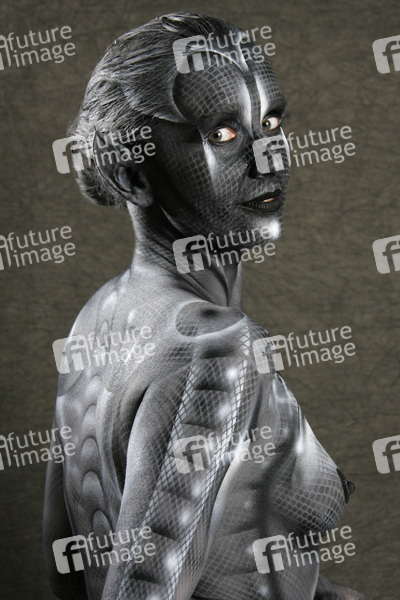 Bodypainting, Erotik, Frau, nackt, drinnen, weiblich, Monster, Außerirdische, Alien, Echse, Körperkunst, Kunst, Malerei, monochrom, erotic, woman, nude, indoor, female, monochrome, lizard, body art, body painting