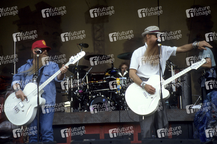Dusty Hill, Frank Beard und Billy Gibbons von ZZ Top beim Soundcheck zum Konzert der 'Recycler World Tour' in der Milton Keynes Bowl. Milton Keynes, 06.07.1991